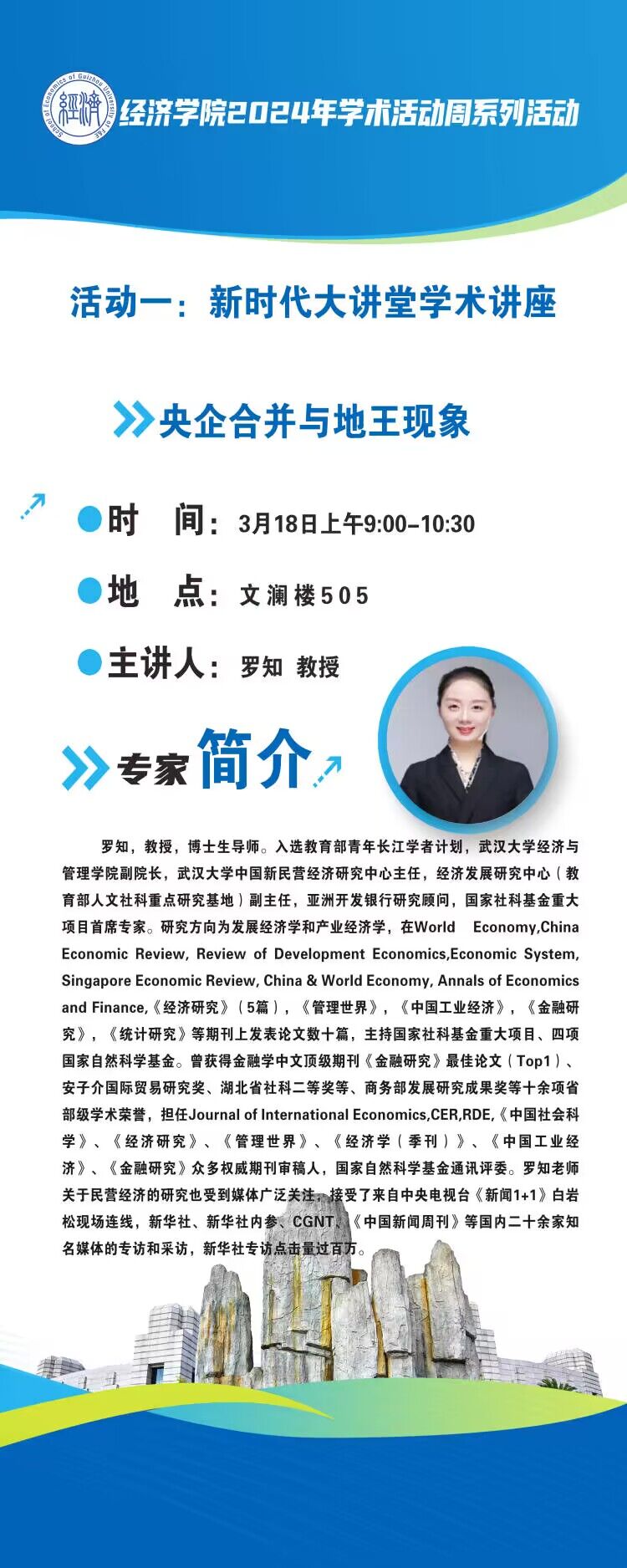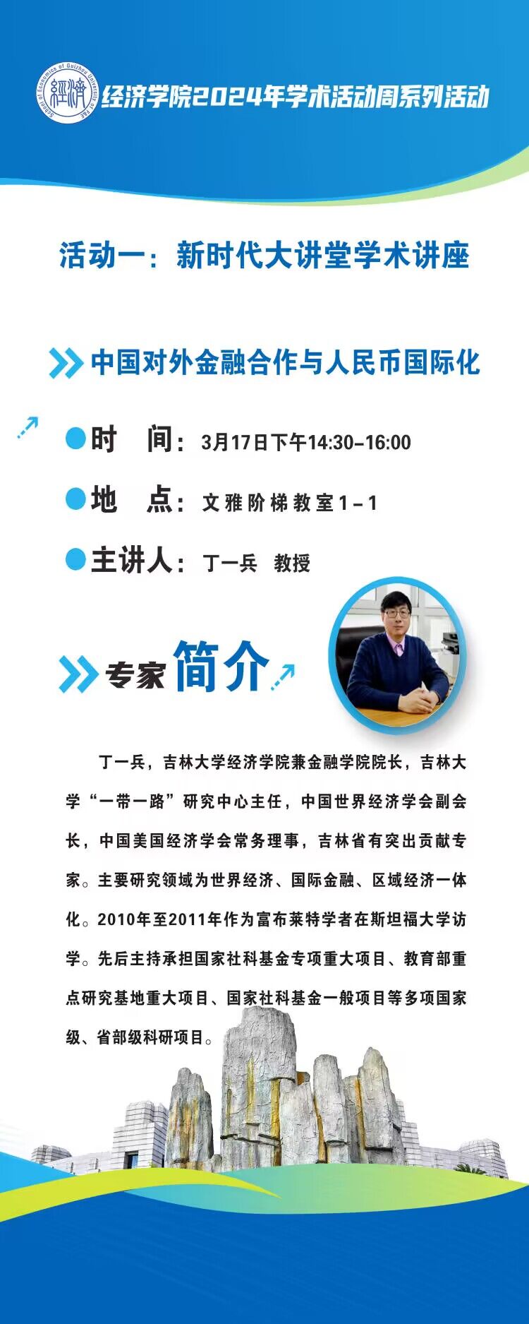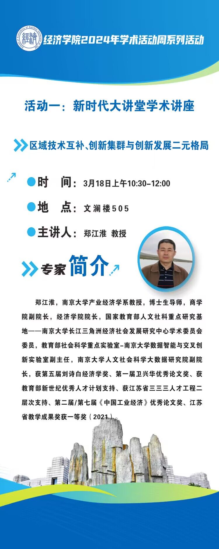 将于本学期教学第三周开展2024年学术活动周系列活动。邀请国内知名专家,通过举办新时代大讲堂系列学术讲座,就学术研究规律性以及中国对外金融合作与人民币国际化、央企合并与地王现象和区域技术互补、创新集群与创新发展二元格局等经济学研究热点问题进行学术交流与探讨。学术活动周将为老师们提供交流机会,为同学们提高创新能力和科研积极性搭建了解平台,共同推进学院的学科建设与科研发展。本次学术活动周也是围绕学校“学术立校”相关要求开展的学术活动之一。