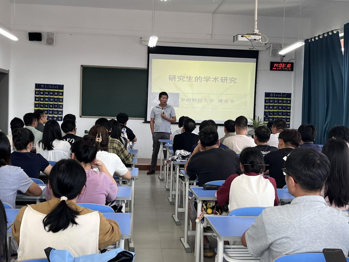 随后,傅院长以“研究生的学术研究”为主题开展专题讲座。讲座聚焦学术论文选题这一核心内容,从选题的基本要求、高水平选题的过程、失败选题的案例等各方面引导研究生聚焦理论经济学的研究范式开展规范的学术研究。通过现场剖析经济学顶尖期刊的佳作,生动展示了如何拟定一个恰当的研究题目;对具有一般性特征的题目进行重点剖析。针对论文的论点构建与论据支撑,傅院长细致讲解了如何从现象中进行观察再探索其本质并落脚到到规范的经济学研究,如何通过有效的变量选取开展逻辑严密的论证,从而得到科学合理的研究结论并有效地提出政策建议。新生们认真聆听、记录,通过案例与理论相结合的讲解,对学术论文写作有了清晰的认知,为后续学术探索筑牢基础,助力研究生开启学术成长新征程。