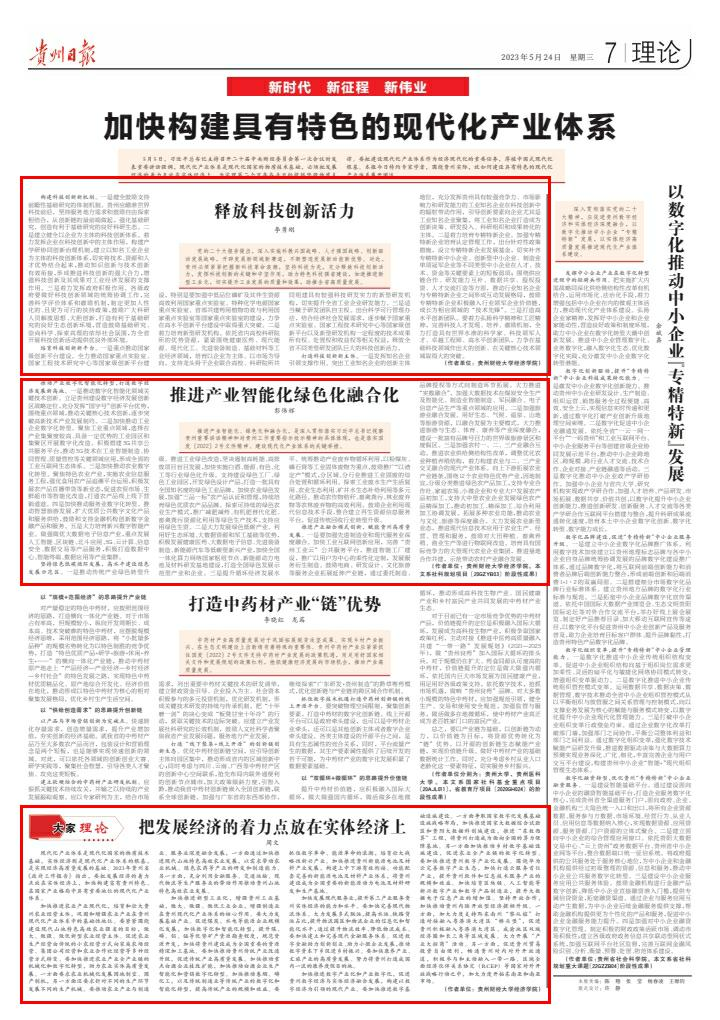 5月24日,《贵州日报》理论版刊发李勇刚理论文章《释放科技创新活力》、刊发彭伟辉理论文章《推进产业智能化绿色化融合化》、刊发周文理论文章《把发展经济的着力点放在实体经济上》。