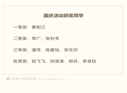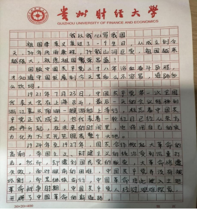 本科生第一党支部于文澜楼1-2教室进行“我以我心写我国”征文评比结果展示及表彰。本次征文比赛有党员、发展对象、积极分子共25名同学参加,通过评选,评出十名优秀作品。征文中,同学们用自己的心声为祖国写赞歌,表达了对祖国的美好祝愿,“与其共进何所幸,热血报国当少年”。