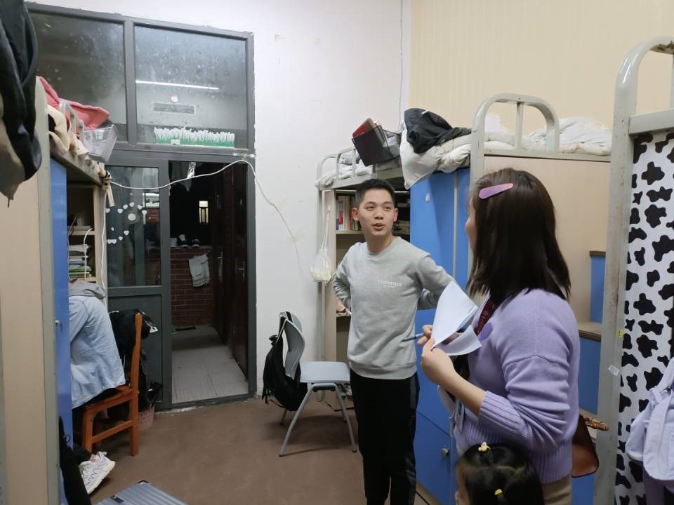 学生会综合部成员前往樱花一和翠竹二学生寝室进行走访。