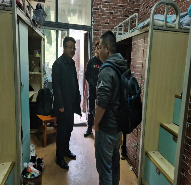 党委副书记赵之友及团委负责人魏来老师带领学生会综合部成员于3月24日晚6点前往樱花苑2栋2020级男寝进行走访。