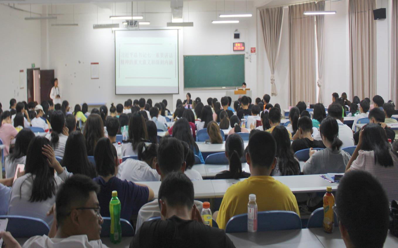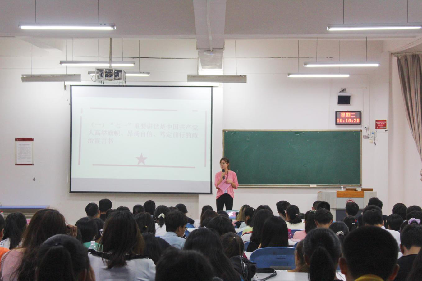 党委书记朱红琼为新生讲授“开学第一课”,宣讲贯彻习近平总书记“七一”重要讲话精神。她提出心怀“国之大者”,必须坚持铸魂育人的要求,并指出“七一”重要讲话精神是中国共产党人高举旗帜、昂扬自信、笃定前行的政治宣言书。