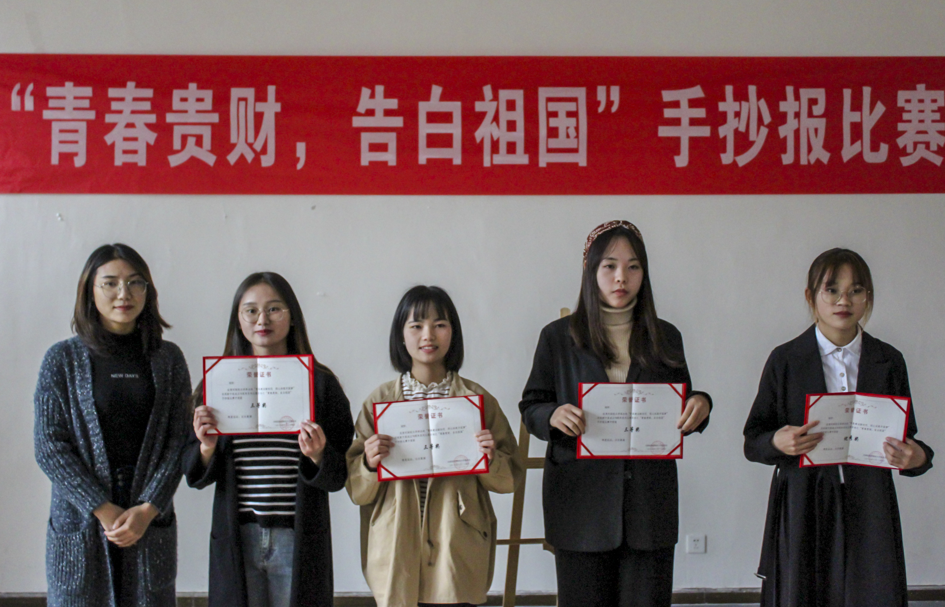 联合承办的“青春贵财,告白祖国”创意手抄报比赛决赛于10月24日在正德楼417举行。校团委宣传部副部长彭译萱老师、管科学院团委负责人吴沛丽老师、工商学院团委负责人孔淑华老师、外语学院团委负责人康维老师和校新媒体中心学生代表黄丹凤同学担任评委。