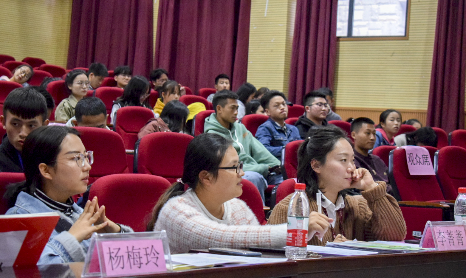 团委负责人李菁菁老师,2019级辅导员杨志远老师以及第四届演讲比赛第一名杨梅玲作为评委出席。