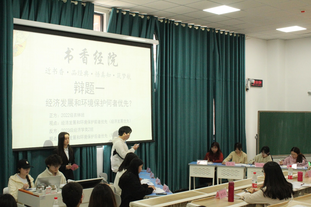 在文思阶教2-1教室举办了2024年度“书香经院”第三期比赛,由资源与环境经济学系黄海燕老师、杜雪莲老师、罗美老师担任评委。参赛人员、评委和观众共计115人参加本次活动。