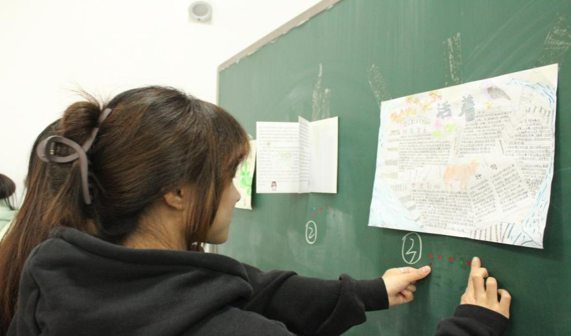 接下来是“记录经典”优秀笔记评选,该环节共有三份作品参与评选,分别是三位同学对三本经典书籍阅读后用手抄报,阅读感谢等形式表达的见解和想法,各位评委老师和观众认真阅览每一份作品,秉持着公平公正的态度为我们的参赛选手评分。