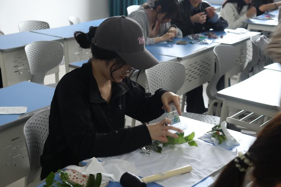 在老师的悉心指导下,同学们认真挑选形态各异的叶片与花瓣,结合个人创意巧妙排布构图,将花叶固定于布料或纸张之上,通过均匀、适度的敲击,把植物天然脉络清晰拓印于纸面,随后依次进行定型、整理等工序。大家凝神专注、静心创作,在一锤一印间感受传统技艺的细腻与温度,将寻常草木化作一件件独具自然意趣的非遗作品。