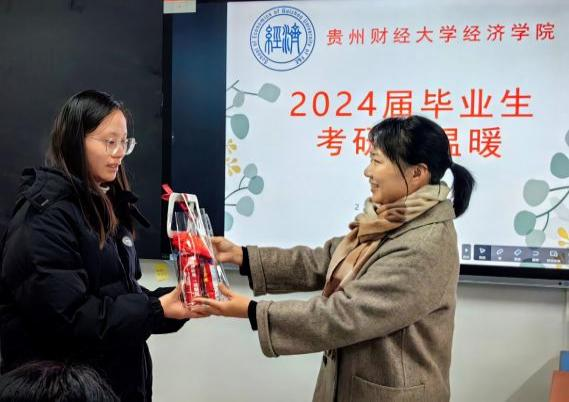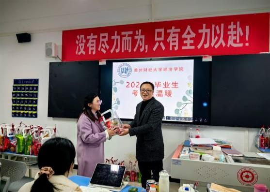 最后,老师和学生代表为考研学子发放“考研加油包”。加油包寓意“红红火火”,其上印有“未来可期”“好运满满”的祝福语;礼包中装有零食、暖贴、花茶、保暖袜等,饱含着老师们的殷殷祝福,寓意今年一“研”为定,明年定为“研”一,鼓励同学们全力以赴、稳定心态,争取一战成硕。