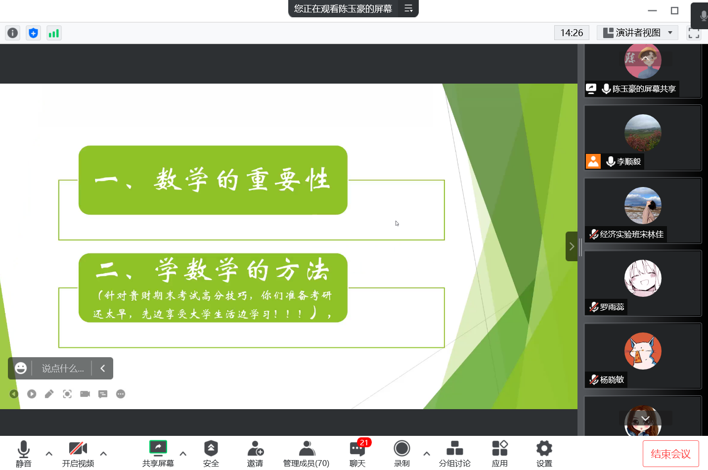 举办了主题为“优秀学长讲大一高数学习方法与心得”的线上讲座和交流活动,邀请到2020级经济学实验班的陈玉豪同学主讲,黄色漫画