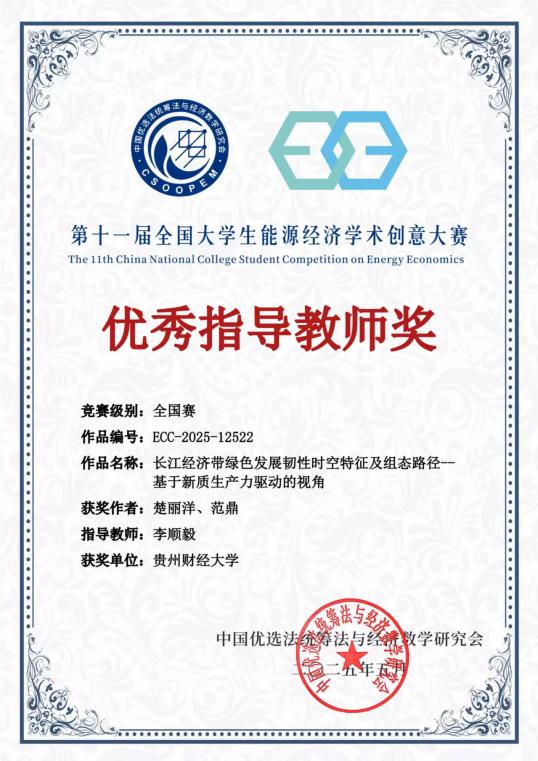 各参赛团队在能源经济领域的不同研究方向上展现出了出色的学术素养和实践能力,凭借深入调研和独到见解,针对我国能源经济发展的现状与挑战,提出了具有前瞻性和可操作性的解决方案,赢得了评委的高度评价。指导教师李顺毅教授获赛事组委会颁发的“优秀指导教师奖”。