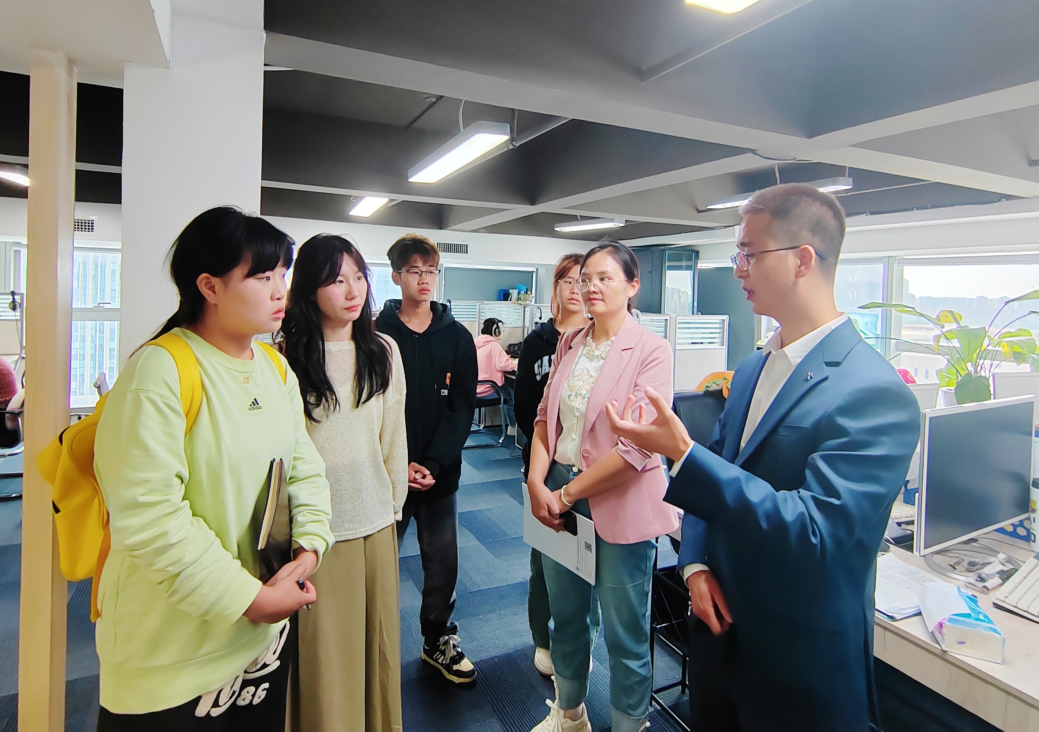 最后,公司人力资源部主任杨幸艳带领学生参观了公司呼叫中心办公区域,现场感受了黄色漫画和运营氛围,对实习实践、岗位具体内容做了介绍和交流。