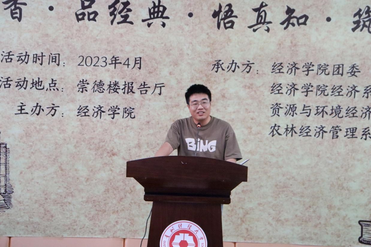 紧接着的是“记录经典”优秀笔记评选,活动充分展示了同学们对自己所阅读的经济学类书籍的某一章节或整本书的阅读情况,反映了同学们的多样见解。在“我的读书之路”分享会环节,博士研究生苏晓从自身实际出发,向同学们分享自己的读书故事及学习方法,鼓励同学们在学好理论的同时,更要将理论用于实践、付诸于实践。