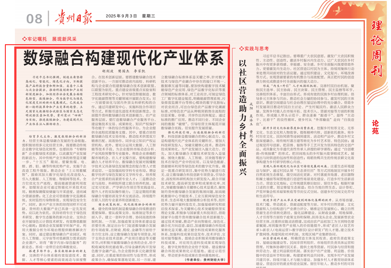 习近平总书记强调,制造业要坚持高端化、智能化、绿色化方向,不断提高产品科技含量和附加值。省委十三届七次全会提出,推动科技创新和产业创新深度融合,加快经济社会发展全面绿色转型。数绿融合,作为数字化与绿色化深度交织的新兴发展模式,已然成为新一轮科技革命和产业变革的趋势。立足国家大数据综合试验区与国家生态文明试验区叠加优势,贵州需以“四新”为目标,推进数绿融合,为建设现代化产业体系注入强劲动力。